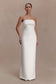 The SLOANE Strapless Maxi Dress With Pearls is designed to captivate through considered embellishment and clean structure. Featuring a strapless neckline with a sculpted front fold, it’s finished with delicate pearl detailing along the folded edge for a quiet point of shine. A sheer back panel with internal boning adds support and contrast, traced with pearl trim that highlights the dress’s architectural lines. Fully lined for comfort and balance, this maxi-length silhouette is completed with a centre-back split and invisible zipper for ease of movement. Elegant and composed, this dress is made for moments that feel intimate, elevated, and unforgettable.