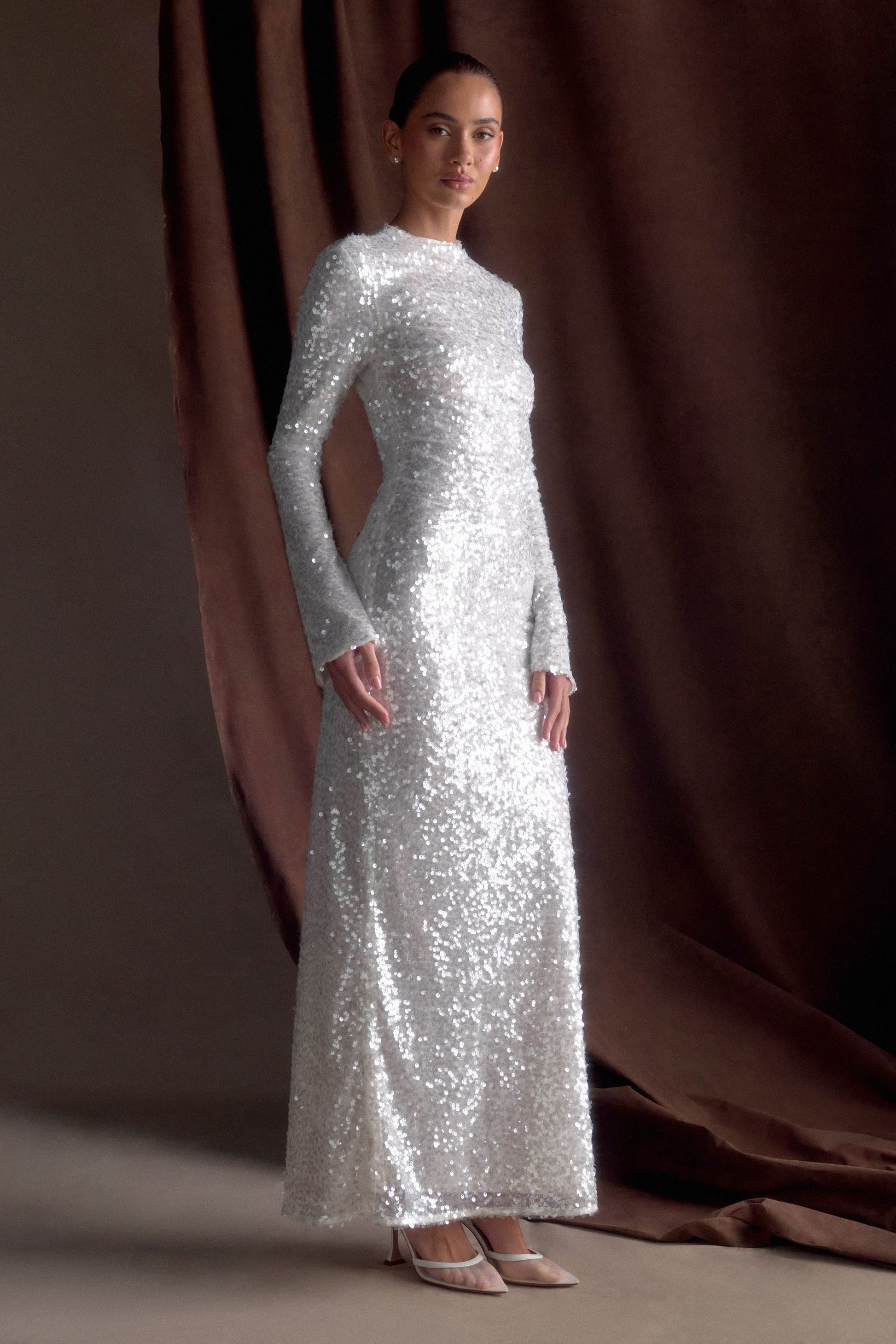 The SOFIA Long Sleeve Sequin Maxi Dress is the ultimate statement in glamour. Designed with a sleek turtleneck and long sleeves, this gown offers a striking contrast to its daring open-back design. The scratch sequin fabrication catches the light from every angle, creating a show-stopping effect. A delicate button-and-loop closure at the back neck adds refinement, while the back zip and hook-and-eye fastening ensure a seamless fit. Fully lined for comfort and elegance, the Sofia dress is perfect for black-tie events, red-carpet moments, and nights that call for pure radiance.