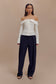 The SPENCER Off Shoulder Shirting Top effortlessly blends classic tailoring with a modern twist. Featuring a centre front button closure and rounded collar shaping, this top showcases a chic Bardot neckline that elegantly frames the shoulders. Its fitted design and long sleeves with flared cuffs add a touch of sophistication and drama. Perfectly versatile, the Spencer pairs beautifully with the Angie Pleated Buckle Mini Skirt for a playful, refined look or with the Penelope Pleated High Waisted Pants for a polished, contemporary ensemble.