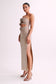 The STASSIE is a stylish maxi dress with cut-out front details, designed with rose ornaments on self-fabric. It also features a strapless neckline, a straight hem, and a maxi length, creating a smooth silhouette, adorned with hot fix embellishments.