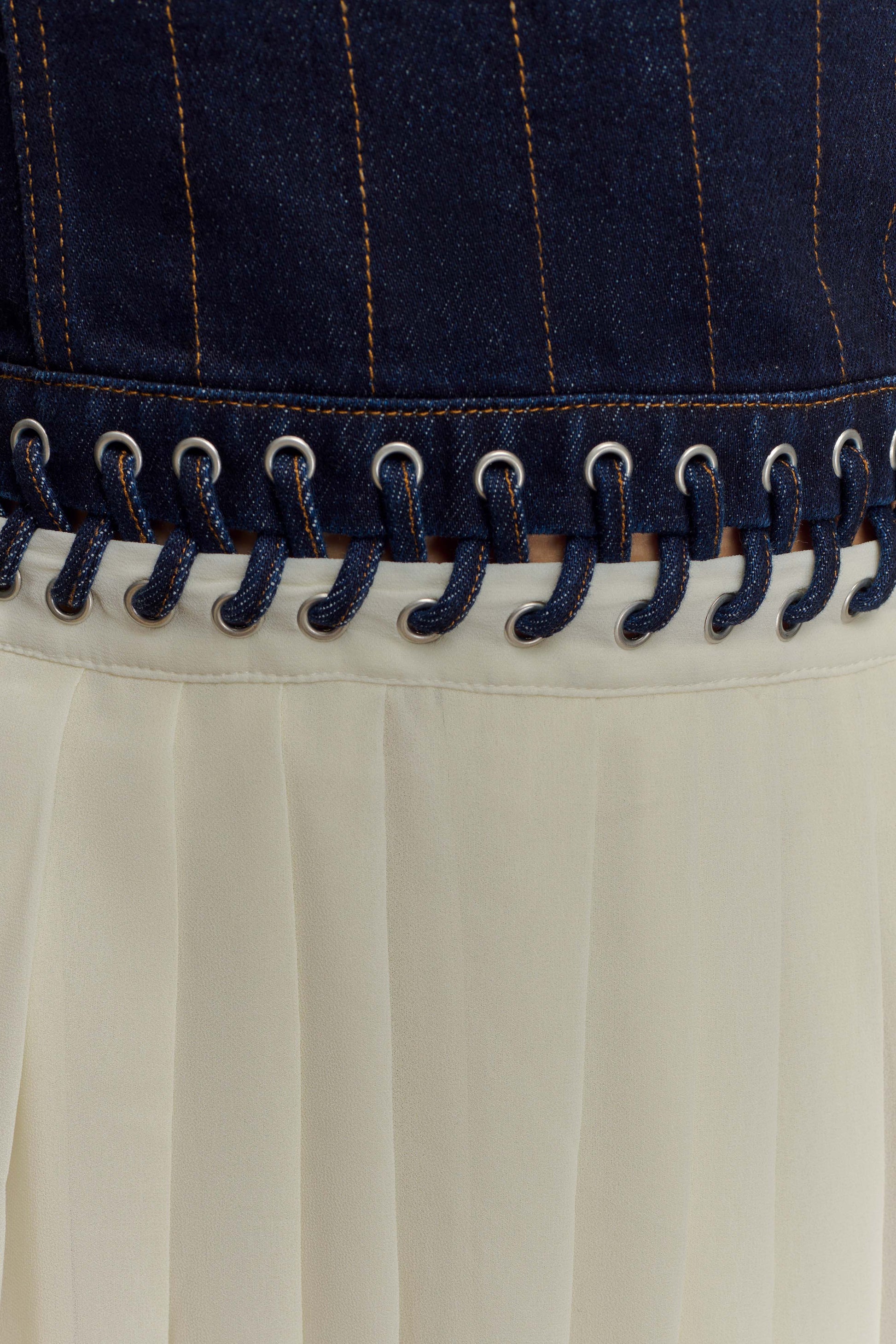 The SUELLA Chiffon Denim Maxi Dress is a statement in contrast and craftsmanship. Featuring a strapless, structured denim bodice with internal grip tape for a secure fit, it’s designed to contour through the waist and flatter the bust. A pleated chiffon skirt flows effortlessly from a unique weaved eyelet waist detail, bringing soft movement to the strong denim base. Finished with a centre back zip and full-length silhouette, this dress blends edge and elegance for your next occasion moment.