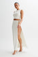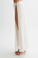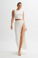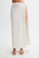 SURI is a long, subtly asymmetrical maxi skirt with thigh-high, side-seam split and custom MESHKI hardware at the closure. Cut like a wraparound skirt but much shorter, Suri wraps around the waist once and is then tied together via one-of-a-kind hardware at the waistband. The rest of the closure hangs open, creating the illusion of a thigh-high slit. Unusual and oh-so risque, the skirt’s silhouette is of a typical maxi skirt. Make this ensemble stand out even more by pairing it with the matching Suri Slinky Cowl Back Top to complete the look.