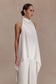 The SYDNEY Asymmetrical Satin Halter Top is designed to elongate through sharp, considered proportions. Featuring a halter neckline secured with a side button closure, it reveals a low, open back for striking contrast. The asymmetric high-low hemline creates movement and dimension, while the longline silhouette enhances its sculptural appeal. Crafted in fluid satin and left unlined for a lightweight feel, this piece delivers clean impact with modern intent.