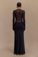 The TANIA Slinky and Mesh Long Sleeve Maxi Dress combines elegance with sultry sophistication. Featuring a high neckline and a daring mesh bodice, this dress highlights your curves with a jersey halter overlay that adds a touch of texture and contrast. The long sleeves provide a sleek, balanced look while the low-rise skirt with centre-front ruching creates a flattering silhouette. The dramatic fishtail hem shape adds to the dress's allure, offering a fluid, graceful movement as you walk. Designed with a maxi length for ultimate glamour, this dress is perfect for making a statement at any formal or special occasion.