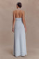 The VEDA Slinky Halter Maxi Dress is designed to contour with confident precision. Featuring a halter V neckline secured with a back button closure, it frames the shoulders while revealing a striking open back. A sculptural hardware detail at the waist defines the silhouette, drawing focus to the fitted bodycon shape. Fully lined for comfort and falling to a sleek maxi length, this design balances fluid movement with deliberate structure — modern, minimal, and made to command attention.