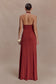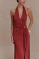 The VEDA Slinky Halter Maxi Dress is designed to contour with confident precision. Featuring a halter V neckline secured with a back button closure, it frames the shoulders while revealing a striking open back. A sculptural hardware detail at the waist defines the silhouette, drawing focus to the fitted bodycon shape. Fully lined for comfort and falling to a sleek maxi length, this design balances fluid movement with deliberate structure — modern, minimal, and made to command attention.