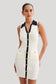 The VERUKA Collared Contrast Knit Mini Dress is a captivating blend of sophistication and contemporary flair. Featuring a flattering V neckline and a chic collar, this dress exudes timeless charm. The non-functional centre front placket with centre front buttons adds a touch of elegance, while the contrast placket and collar offer a modern twist. With front functional pockets and a mini length, it seamlessly combines style and functionality. Sleeveless for a chic silhouette, and crafted from unlined knit fabric, this dress offers comfort and versatility for any occasion. Whether you're stepping out for brunch with friends or attending a stylish soirée, the Veruka dress is sure to make a statement.