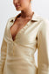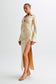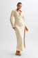 This is a long-sleeved maxi dress with a deep collared neckline and centre front button detail. The sleeves end in lined, flared cuffs and the skirt ends in a clean-cut hem with a centre side hem split. The waist is lightly cinched to create a loose hourglass silhouette, further complemented by the soft draped MESHKI blend fabrication. Elegant in its simplicity, this dress is the perfect choice for quick glam.