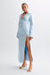 This is a long-sleeved maxi dress with a deep collared neckline and centre front button detail. The sleeves end in lined, flared cuffs and the skirt ends in a clean-cut hem with a centre side hem split. The waist is lightly cinched to create a loose hourglass silhouette, further complemented by the soft draped MESHKI blend fabrication. Elegant in its simplicity, this dress is the perfect choice for quick glam.