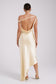 YVETTE is a Slip Maxi Dress with a low, open back, a slight cowl detail for the front neckline, and a loose, flowing hem. The front neckline dips into a slanted arrangement, with one shoulder strap up for a sleeveless look and the other down in an off-shoulder style. The asymmetrical hem is much the same, with one part gathered above the ankle and the other hitting the ground. Two thin fabric straps run across the back, adding extra detail to the low, back neckline.