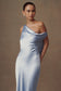 YVETTE is a Slip Maxi Dress with a low, open back, a slight cowl detail for the front neckline, and a loose, flowing hem. The front neckline dips into a slanted arrangement, with one shoulder strap up for a sleeveless look and the other down in an off-shoulder style. The asymmetrical hem is much the same, with one part gathered above the ankle and the other hitting the ground. Two thin fabric straps run across the back, adding extra detail to the low, back neckline.