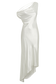 YVETTE is a Slip Maxi Dresss with a low, open back, a slight cowl detail for the front neckline, and a loose, flowing hem. The front neckline dips into a slanted arrangement, with one shoulder strap up for a sleeveless look and the other down in an off-shoulder style. The asymmetrical hem is much the same, with one part gathered above the ankle and the other hitting the ground. Two thin fabric straps run across the back, adding extra detail to the low, back neckline.